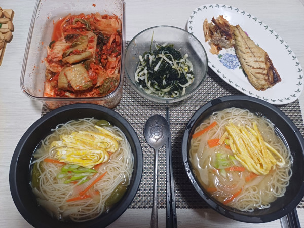잔치국수 햇김치 파래무침 고등어구이랑 보리굴비