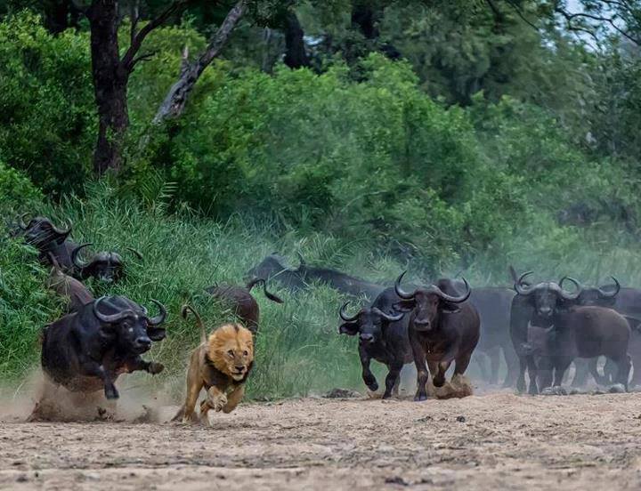 자세히 보면 물소 3마리 정도만 쫓아오는데