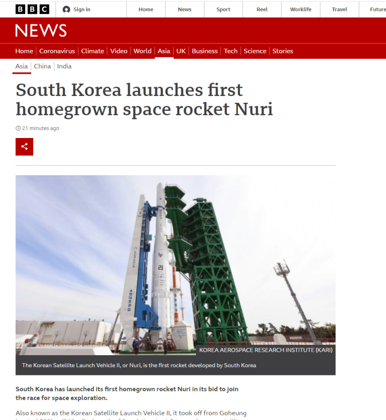 BBC에서도 누리호 발사 긴급보도하네요