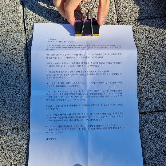 작년 10월, 비록 성폭력 2심 재판 중 증거가 아닌, 피고인이 무죄를 주장하기 위해 작성한 의견서를 마지막 대법원 판결을 앞두고 불법유출이라는 또 다른 범죄로 인해 언론에 공개되었던 것이지만, 제가 당시 대표팀 팀원들은 비판 하였다는 사실은 명백한 저의 잘못입니다. 고개 숙여 사과드립니다.
