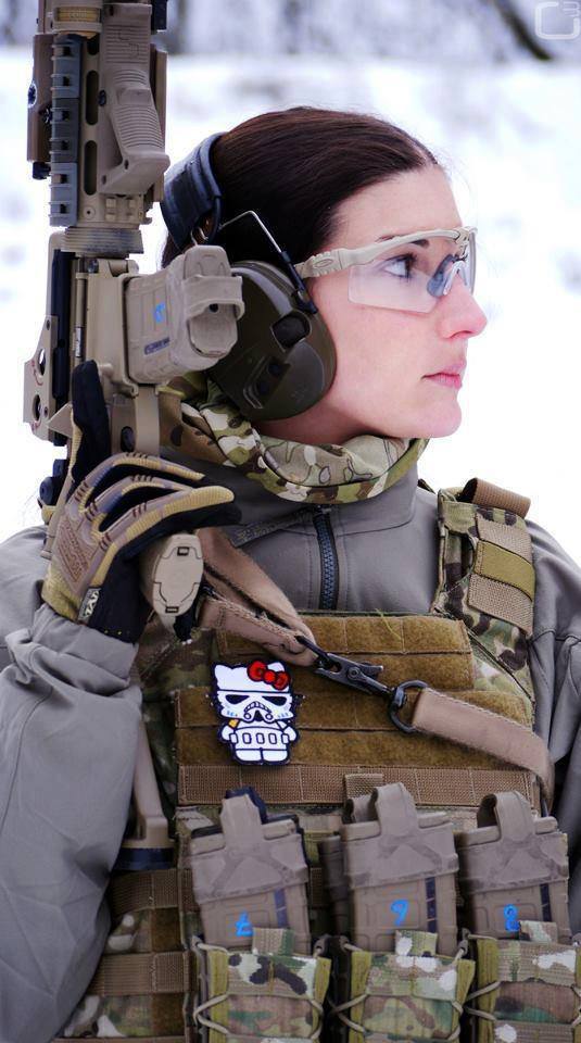 방독면쓴 헬로키티를 군복에 부착한 여군
