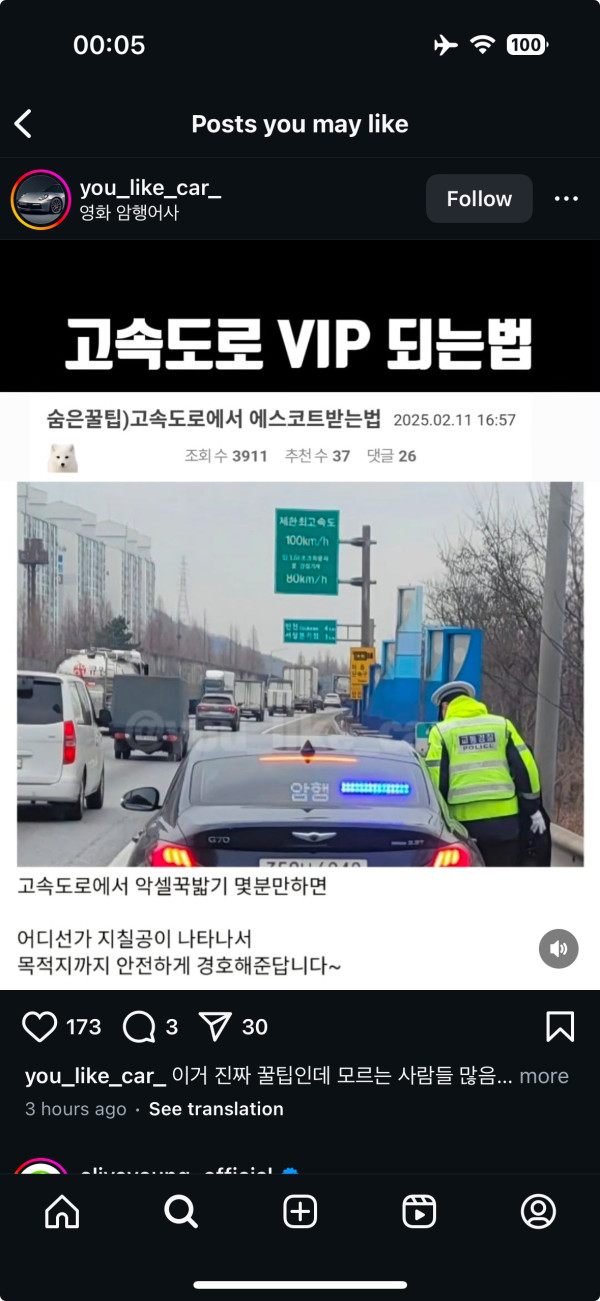 자동차 전용도로에서 법규를 위반하면 VIP 대접을 받아요.