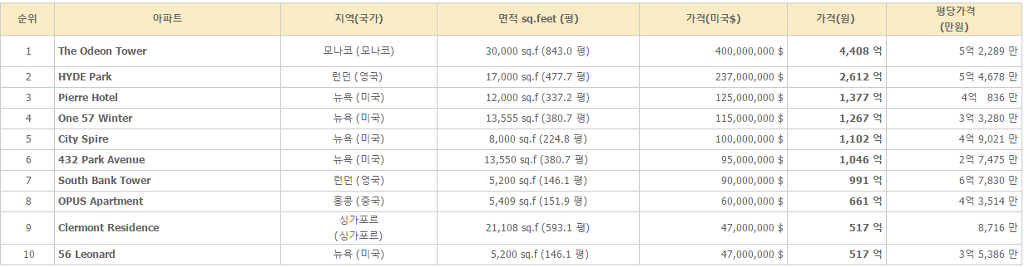 세계에서 가장 비싼 아파트 1위~10위