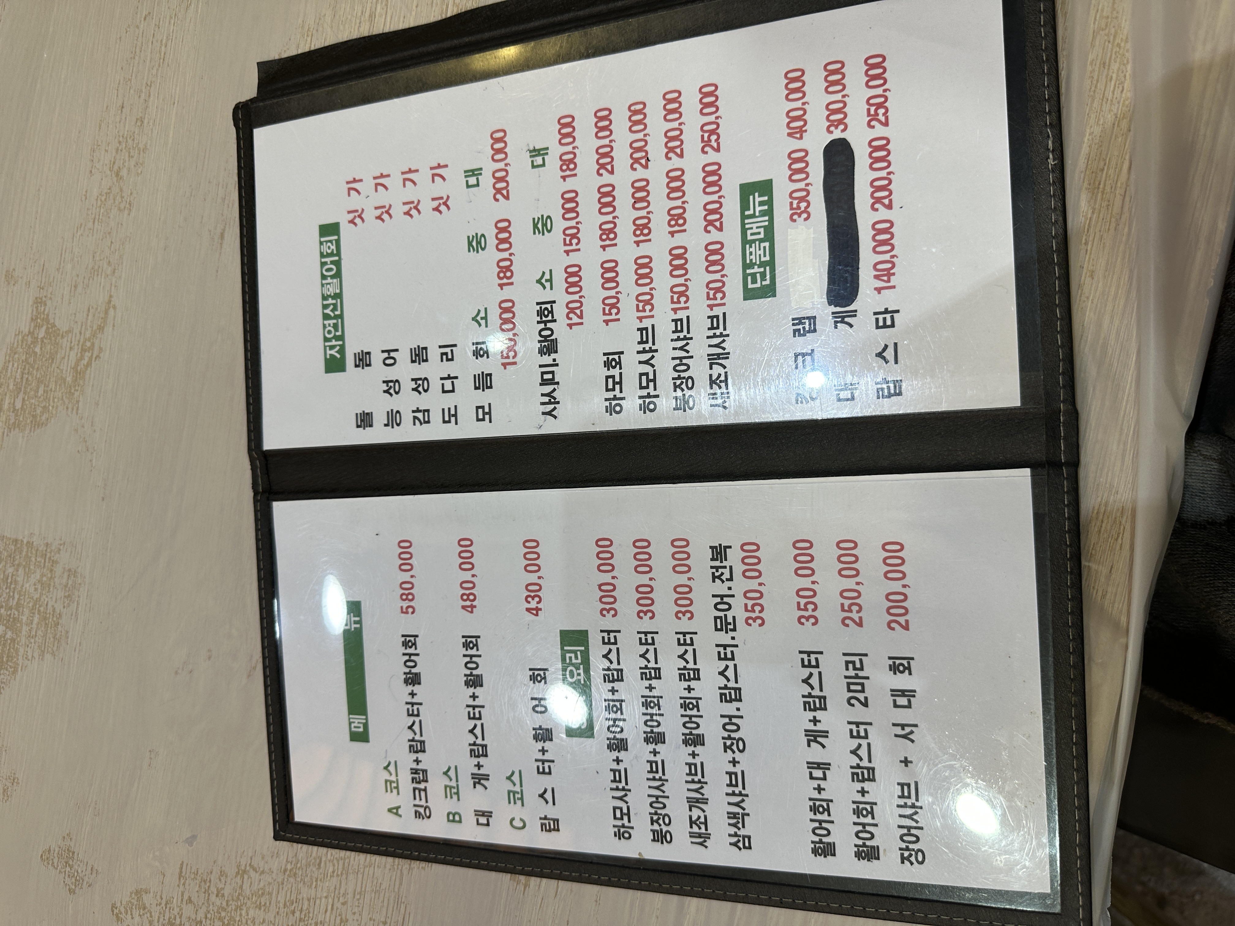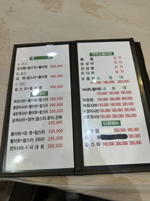 여수 음식점 메뉴판