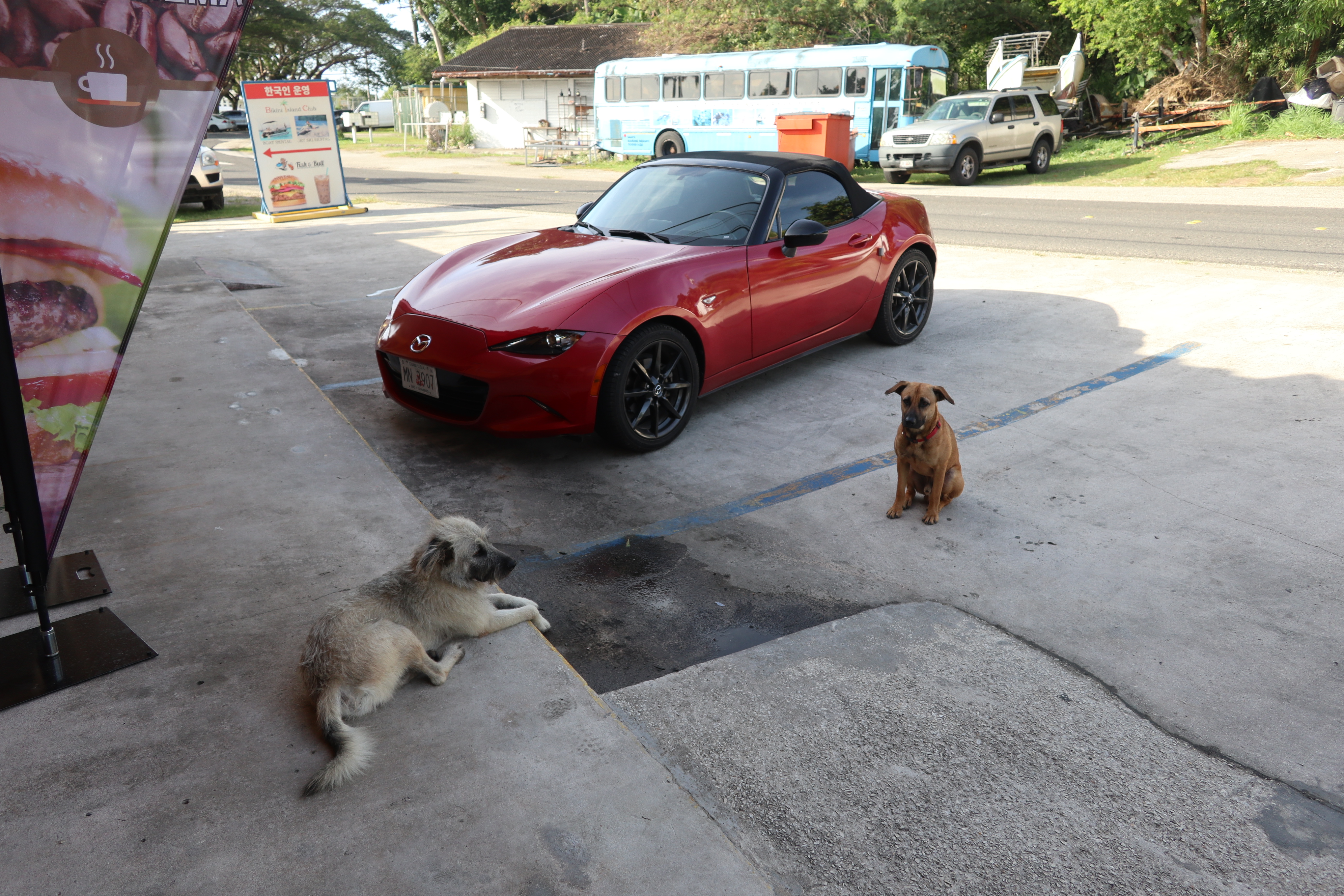 마쯔다 미아타 앞에 개 두마리