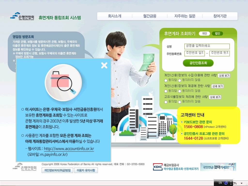 전국은행연합회 웹 사이트(http://www.kfb.or.kr/)에 있는 휴면계좌통합조회가 있는데 이제 최고인 듯 합니다.