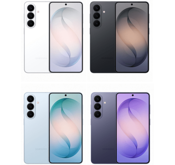 왼쪽 위부터 시계방향으로 화이트, 블랙, 코발트 바이올렛, 스카이블루 색상의 갤럭시S26 모습 / 사진 삼성전자