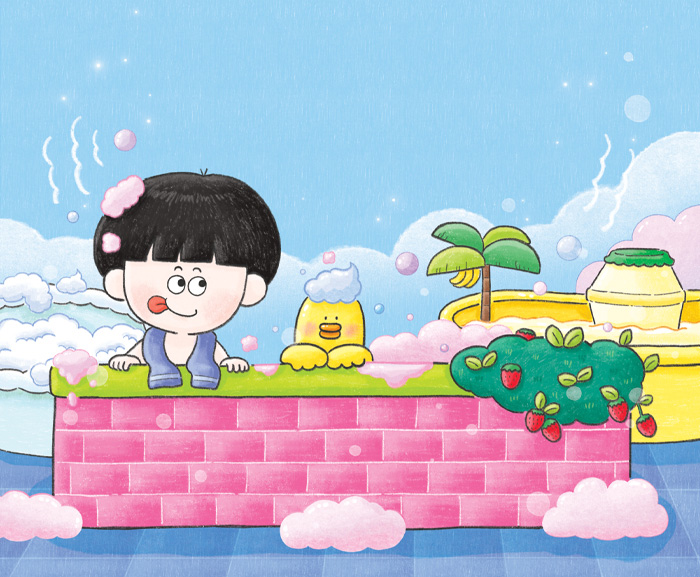 씻기 싫어하는 아이가 우연히 ‘아이들만 입장 가능한’ 목욕탕에 들어가 겪는 하루를 그린 그림책입니다. 새콤한 딸기 주스탕,