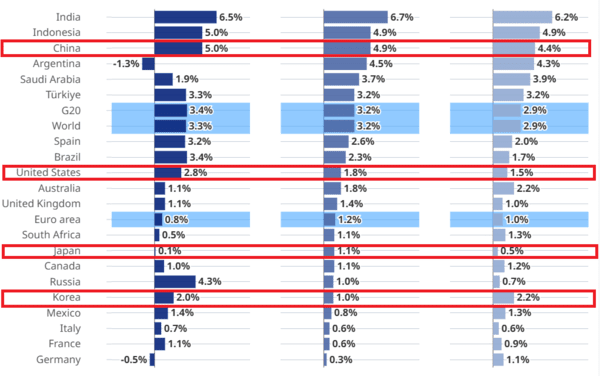 미국은 2024년 2.8%에서 올해 1.8%, 2026년 1.5%의 성장률을 기록한다. 일본은 올해 1.1%의 성장률을 보이지만 내년은 0.5%로 추락한다. 중국은 올해 4.9%에서 내년 4.4%로 내려간다.