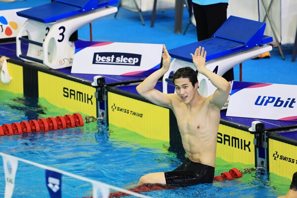 대회 5관왕을 차지한 수영 노민규 선수가 환호하는 모습 / 사진 SK텔레콤