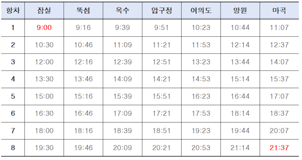 잠실-마곡 구간 한강버스 시간표 / 사진 서울시