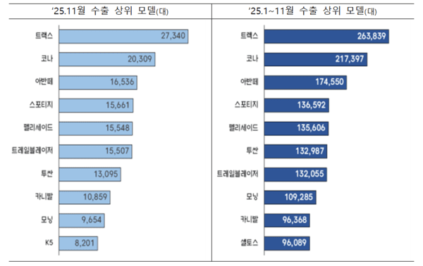 특히 올해 1~11월 누적 자동차 수출액은 660억4000만달러로 동기간 기준 역대 최대치를 달성했다. 연간 수출액은 기존 최고치였던 2023년(709억달러)을 넘어설 가능성도 커지고 있다.
