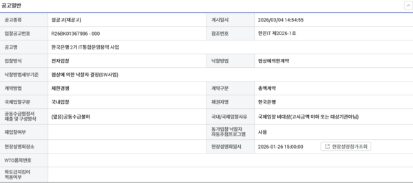 5일 조달청 나라장터 사이트에 따르면, '한국은행 2기 IT통합운영용역 사업'의 규모는 930억원, 기간은 5월부터 2029년 4월까지 3년이다. 단순 계산으로 연간 310억원의 매출이 발생하지만, 106명 이상의 상주 인력을 운영해야 한다는 단서 조항이 붙는다. 업계에서는 금융IT 전문 인력의 인건비를 감안하면 수익이 남는 구조가 아니라는 지적이 나온다.