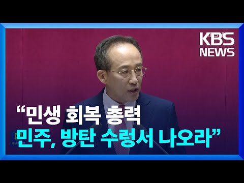 추경호 “민생·미래에 온 힘 쏟자…‘방탄 수렁’서 나오라” / KBS 2024.09.06. KBSNews 0 34 2024.09.06 07:01 https://www.youtube.com/watch?v=lEpIm41nRgw + 3 https://www.youtube.com/feeds/videos.xml?channel_id=UCcQTRi69dsVYHN3ex… + 2 추경호 “민생·미래에 온 힘 쏟자…‘방탄 수렁’서 나오라” / KBS 2024.09.06.