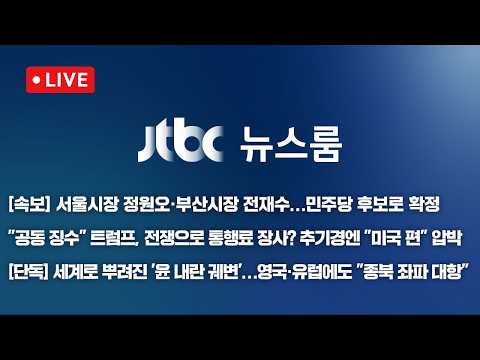 [LIVE/JTBC 뉴스] 뉴스룸 –서울시장 정원오·부산시장 전재수 민주당 후보 확정 / 트럼프, 전쟁으로 통행료 장사? / … JTBCNews 0 7 04.09 14:35 https://www.youtube.com/watch?v=BJVPV6mGTjc + 0 https://www.youtube.com/feeds/videos.xml?channel_id=UCsU-I-vHLiaMfV_ce… + 1 [LIVE/JTBC 뉴스] 뉴스룸 –서울시장 정원오·부산시장 전재수 민주당 후보 확정 / 트럼프, 전쟁으로 통행료 장사? / 영국·EU에도 뿌려진 '윤 내란 궤변 (26.4.9)