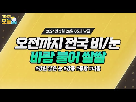 [오늘날씨] 오늘 오전까지 전국 대부분 지역 비, 바람 불어 쌀쌀해요. 3월 26일 5시 기준 기상청 0 696 2024.03.26 07:00 https://www.youtube.com/watch?v=yrS9Q56ijBM + 65 https://www.youtube.com/feeds/videos.xml?channel_id=UCI110BywhJpYRC1XY… + 67 [오늘날씨] 오늘 오전까지 전국 대부분 지역 비, 바람 불어 쌀쌀해요. 3월 26일 5시 기준