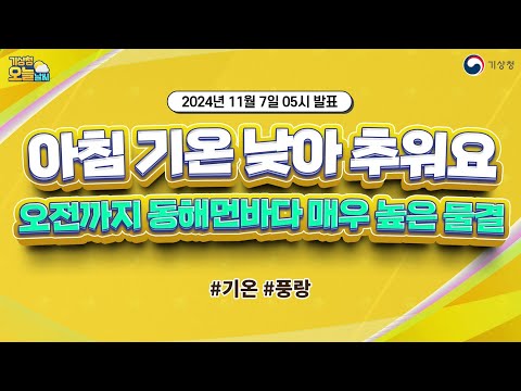 [오늘날씨] 오늘 아침 기온 낮아 추워요! 오전까지 동해먼바다 매우 높은 물결. 11월 7일 5시 기준 기상청 0 385 2024.11.07 07:00 https://www.youtube.com/watch?v=PDJ1ntvmCUU + 18 https://www.youtube.com/feeds/videos.xml?channel_id=UCI110BywhJpYRC1XY… + 18 [오늘날씨] 오늘 아침 기온 낮아 추워요! 오전까지 동해먼바다 매우 높은 물결. 11월 7일 5시 기준