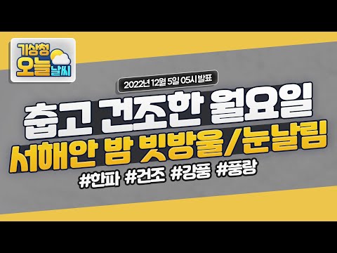 [오늘날씨] 춥고 건조한 월요일, 서해안 밤 빗방울/눈날림. 12월 5일 5시 기준 기상청 0 1327 2022.12.05 07:16 https://www.youtube.com/watch?v=K0OBUXg24Go + 171 https://www.youtube.com/feeds/videos.xml?channel_id=UCI110BywhJpYRC1XY… + 151 [오늘날씨] 춥고 건조한 월요일, 서해안 밤 빗방울/눈날림. 12월 5일 5시 기준