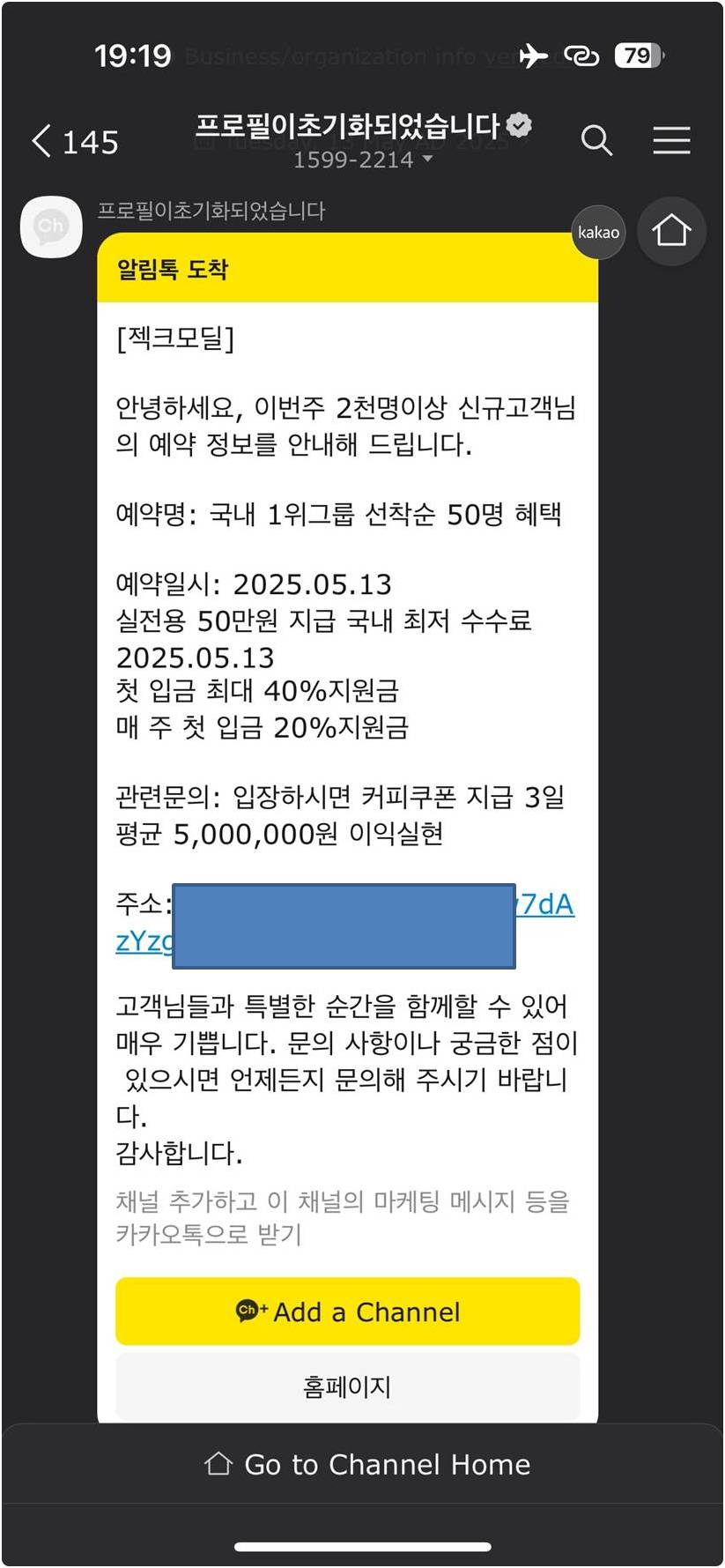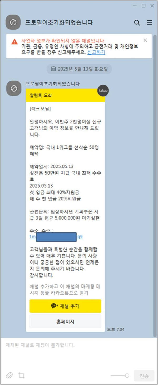 사용하지 않는 카카오톡 채널을 해킹하여 해당 채널에서 보내는 메시지인 양 링크를 보냈다.