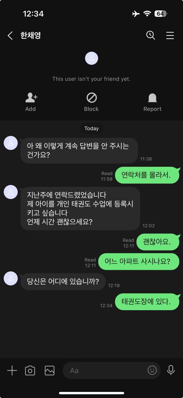 라인 메신저로 온 메시지인데, 마치 평상시에 대화하는 사람인것처럼 말을 걸었다. 태권도 수업에 등록시키고 싶다는데, 저렇게 말을 할 수 있는 건가. 그리고 어느 아파트에 있는지 물어보는데 왜 저런 질문을 하는가.