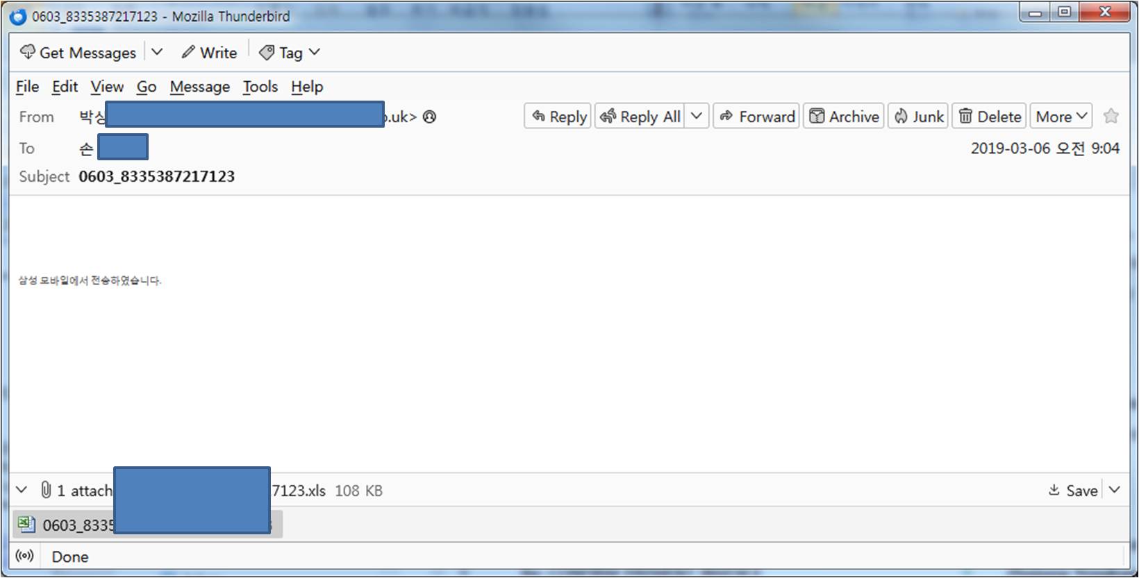 첨부 이메일을 열면 악성 코드를 실행하여 컴퓨터를 감염시킨다.