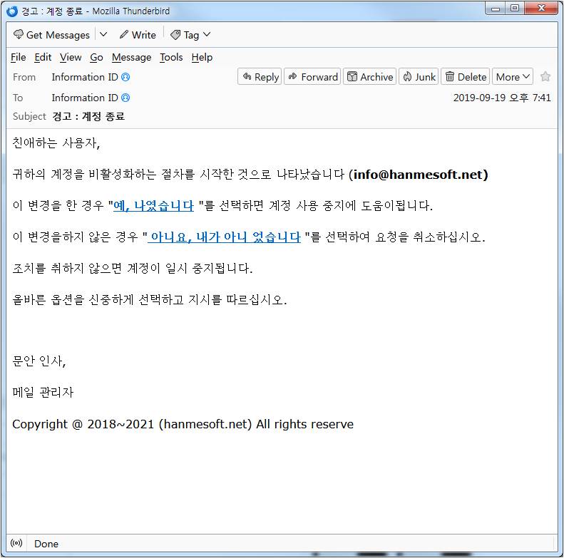 예와 아니오 둘 다 누르면 같은 링크로 간다. 그리고 회사 이메일을 왜 외부에서 관리자랍시고 이메일 보내는 걸까. 심지어 2019년에 보냈는데 아래에 보면 2021이 있다. 놀랍다.